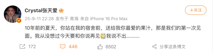 张天爱发文悼念:“10年前的夏天,你站在我的宿舍前,送给我你最爱的果汁,那是我们的第一次见面。我从没想过今天要和你说再见,我说不出……….”